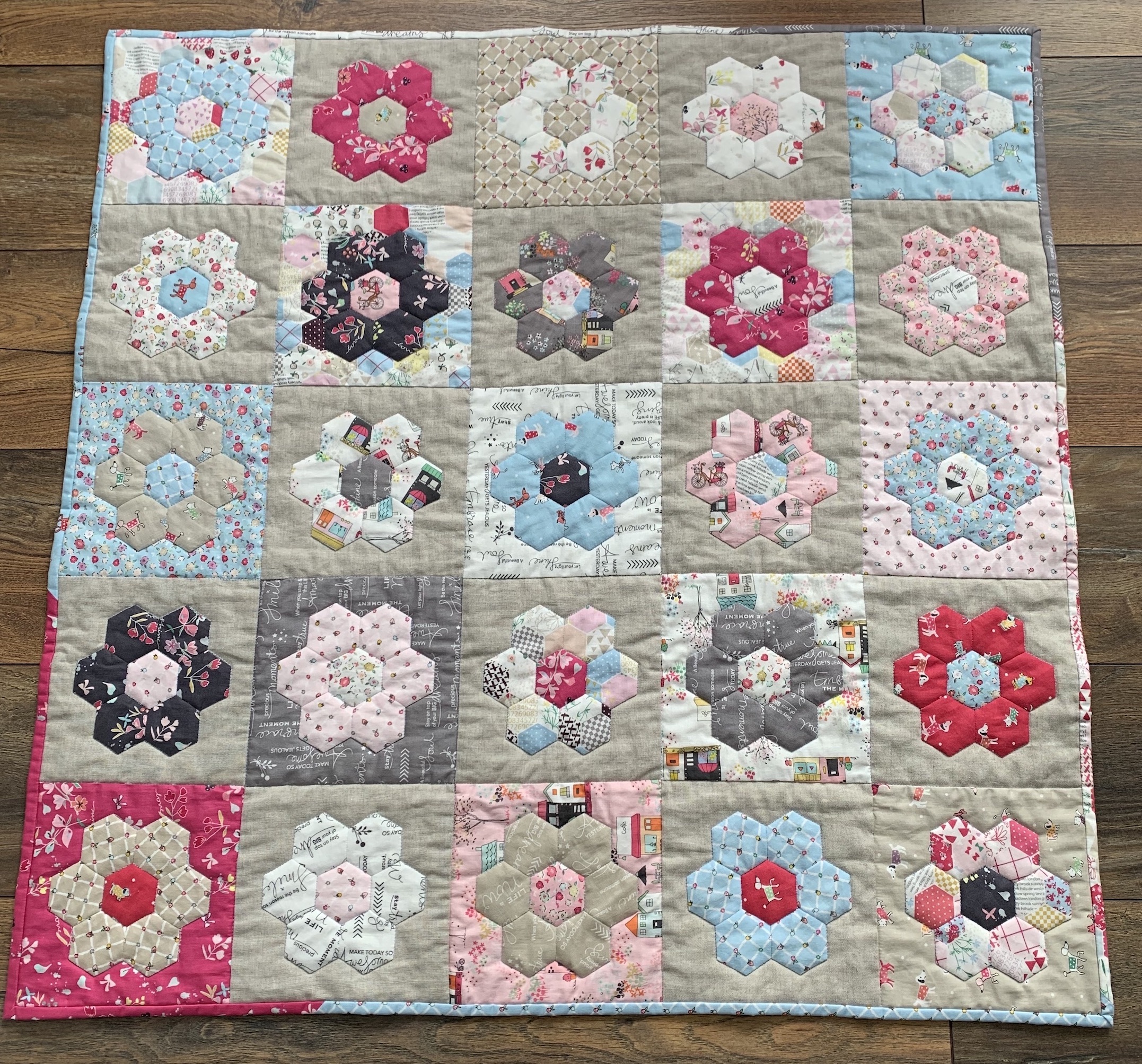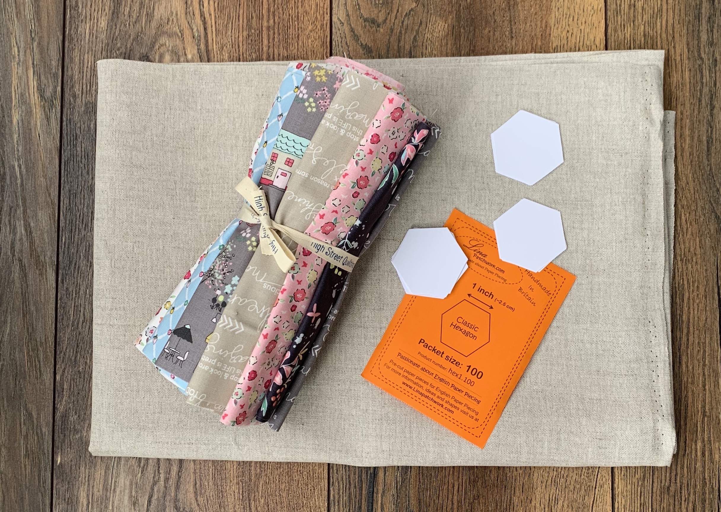 Comes inclusive of 13 feature fabrics, background fabric, 1in hexagon papers.